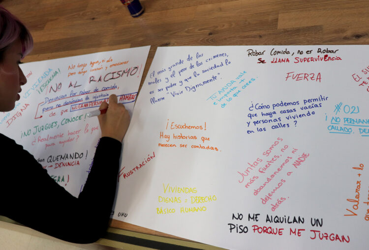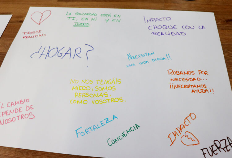 Los estudiantes han valorado muy positivamente la experiencia vivida en esta jornada. “Hemos visto los asentamientos y ha sido duro, ha sido impactante porque es duro ver cómo aquí, tan cerca, hay personas que están a la intemperie en condiciones inhumanas”, o “Un taller como este es una llamada a la solidaridad, es cierto que enriquece culturalmente pero no se puede consentir que a esa manera de vivir se le llame viviendas”, han sido algunas de las reflexiones del alumnado plasmadas en el mural.